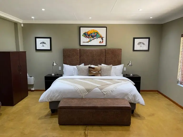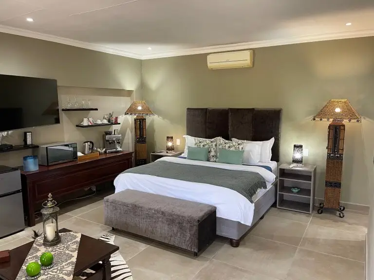 Our Deluxe Suite has a luxurious en-suite bathroom with an oversized shower. Only high quality percale linen is used in our suites ensuring you enjoy a crisp, cool sleep all year round. For your comfort this suite is equipped with a 55″ Smart Tv, a full bouquet of DSTV channels, air-conditioning, bar fridge, complimentary tea & coffee tray, comfortable seating, luxury amenities and toweling as a small safe to store valuables.